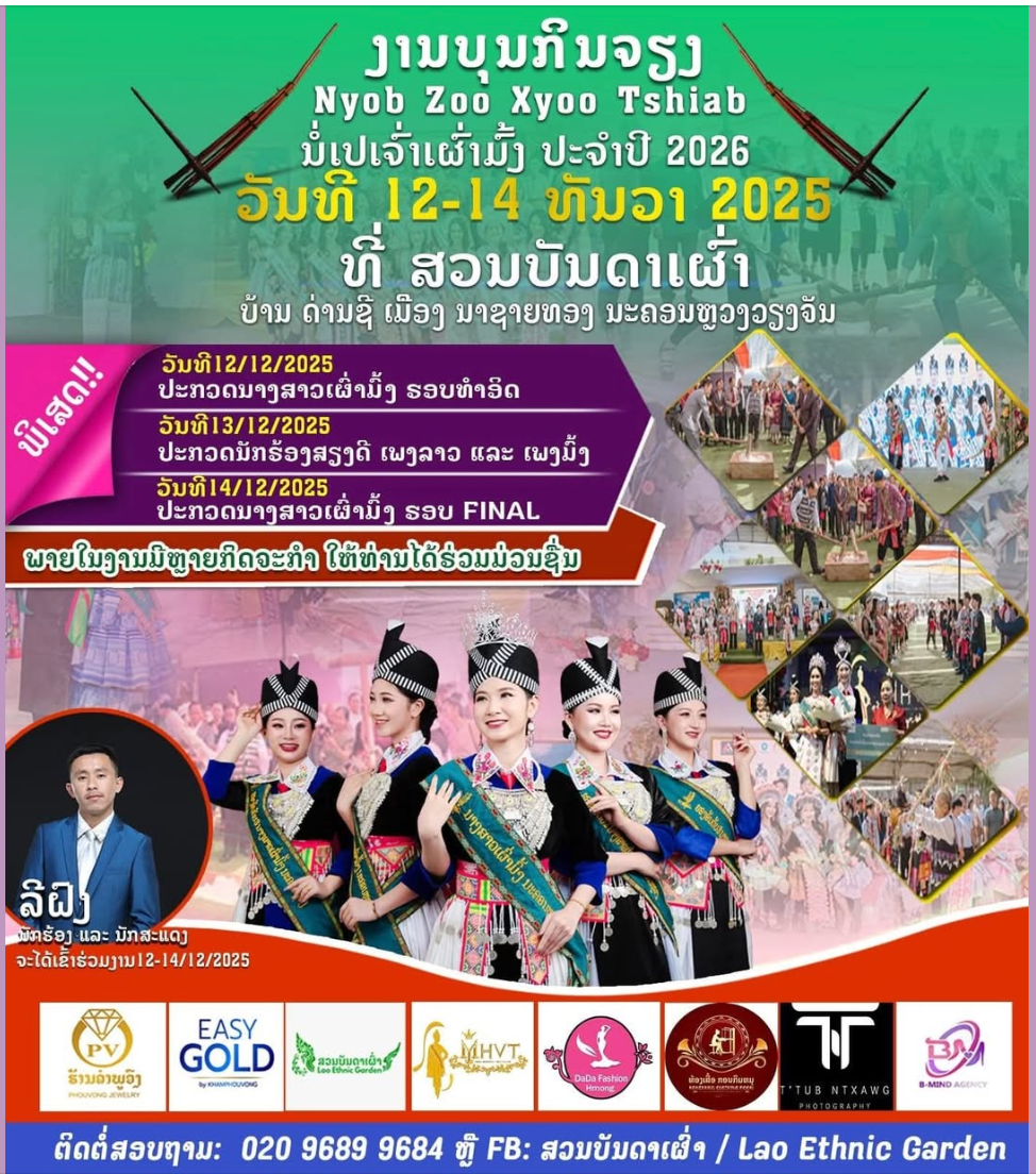 ຂໍເຊີນມ່ວນຊົນທຸກທ່ານ ເຂົ້າຮ່ວມງານບຸນກິນຈຽງ ນໍ່ເປເຈົ່າຂອງພີ່ນ້ອງເຜົ່າມົ້ງ ປະຈຳປີ 2026 ໃນລະຫວ່າງວັນທີ 12-14 ທັນວາ 2025 ທີ່ ສວນບັນດາເຜົ່າ / Lao Ethnic Garden